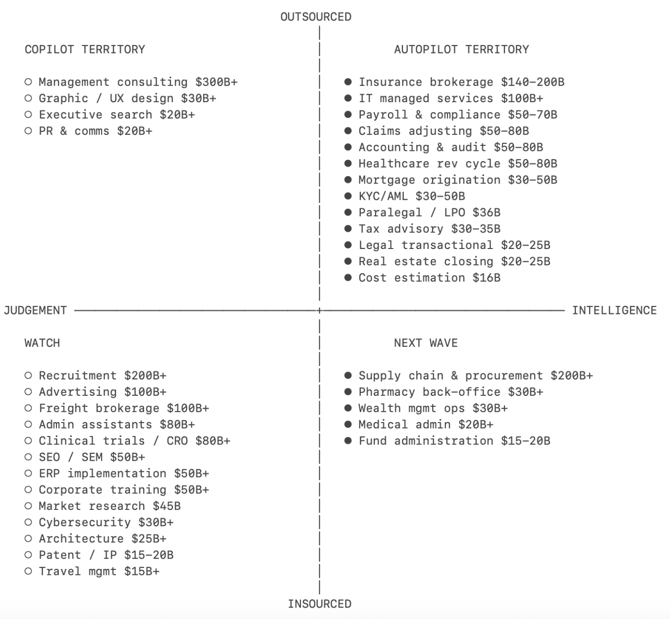注意最后一行——管理咨询TAM最大($3000-4000亿),但因为高度依赖Judgement,目前最难被Autopilot化。这不代表不能做,而是需要更长的数据积累周期。
